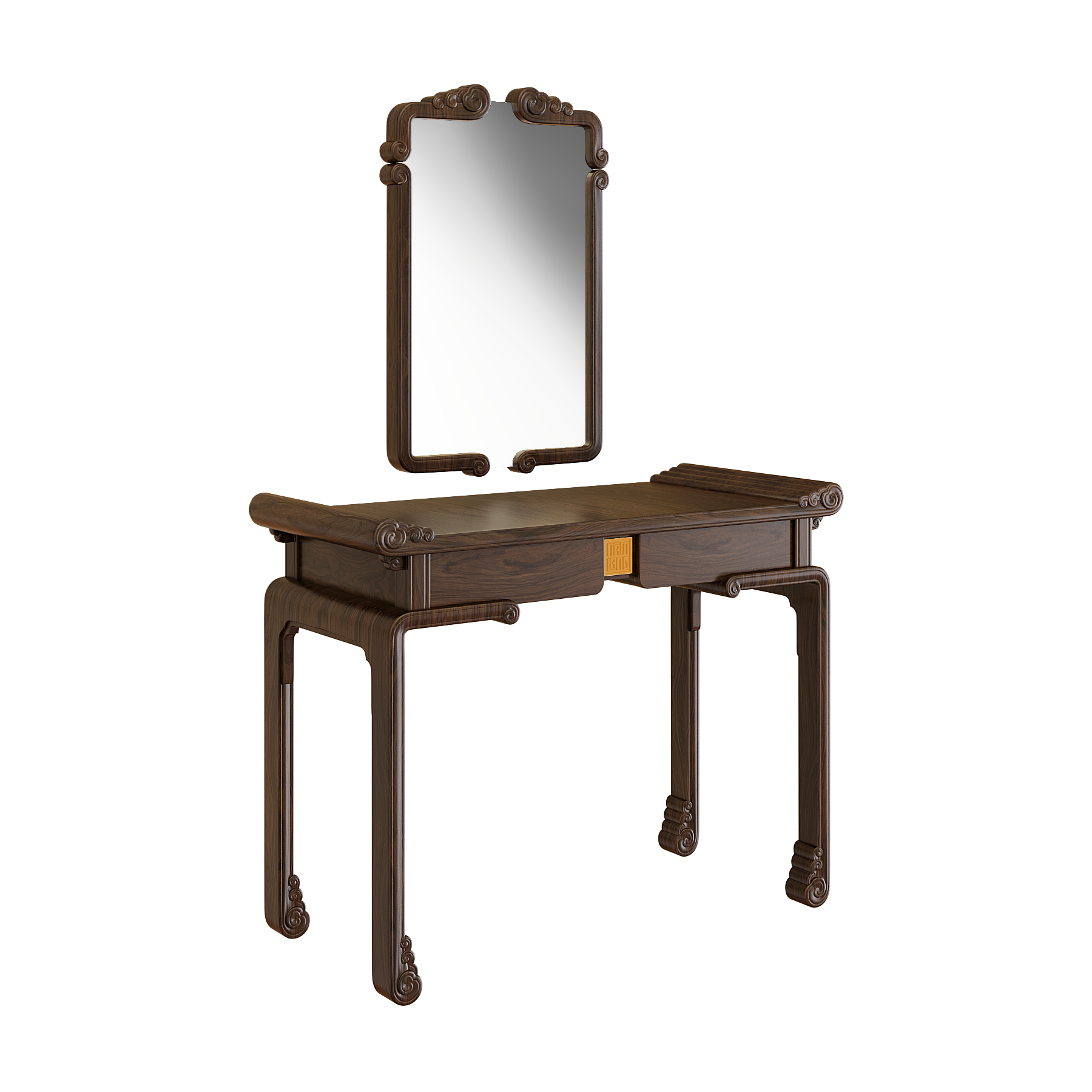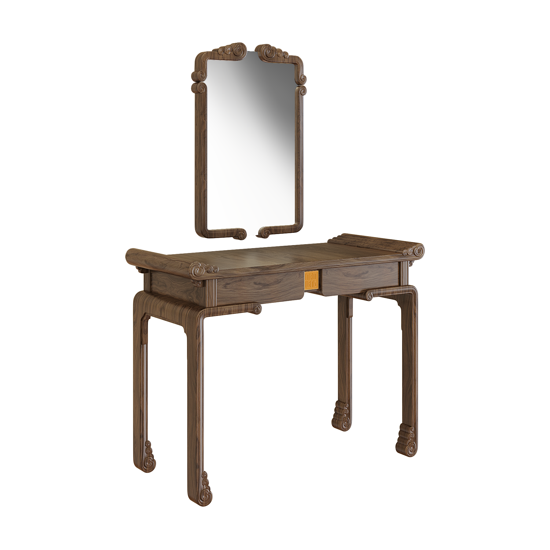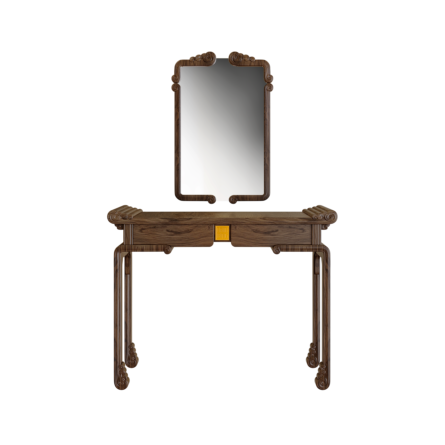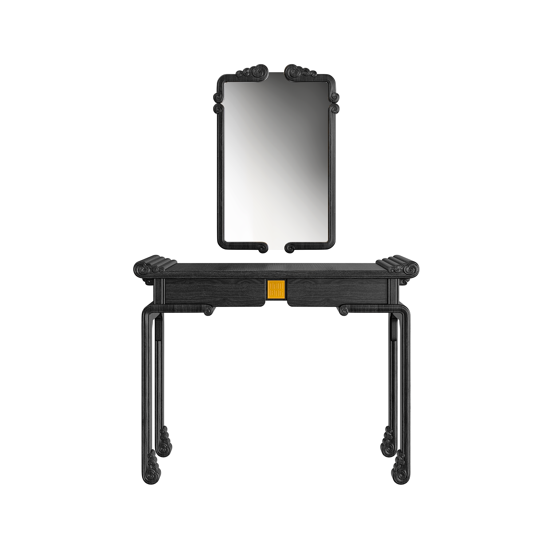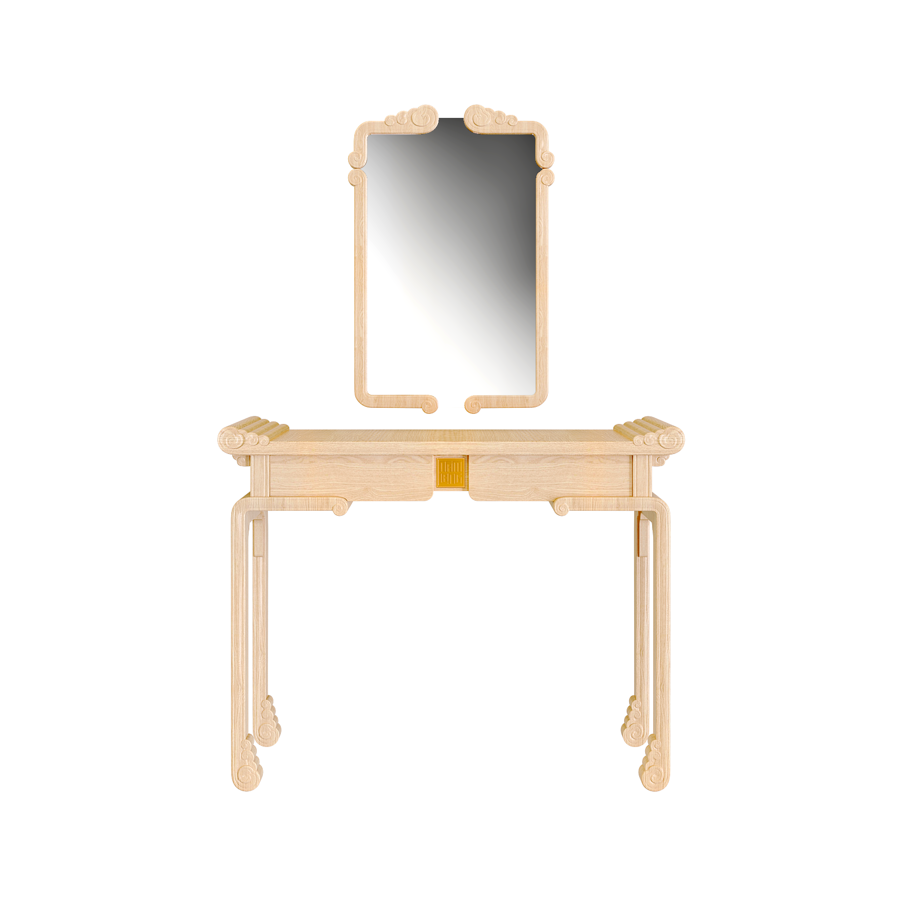 Bàn trang điểm Diễm Vân mang đậm dấu ấn văn hóa Việt với họa tiết Mây Lửa và chi tiết Đầu Dư cách điệu, lấy cảm hứng từ kết cấu nhà gỗ truyền thống. Các đường nét mềm mại, uyển chuyển giữa khối tựa và chân gợi nhắc hình ảnh mái đình, mái chùa xưa, vừa trang nghiêm vừa gần gũi.