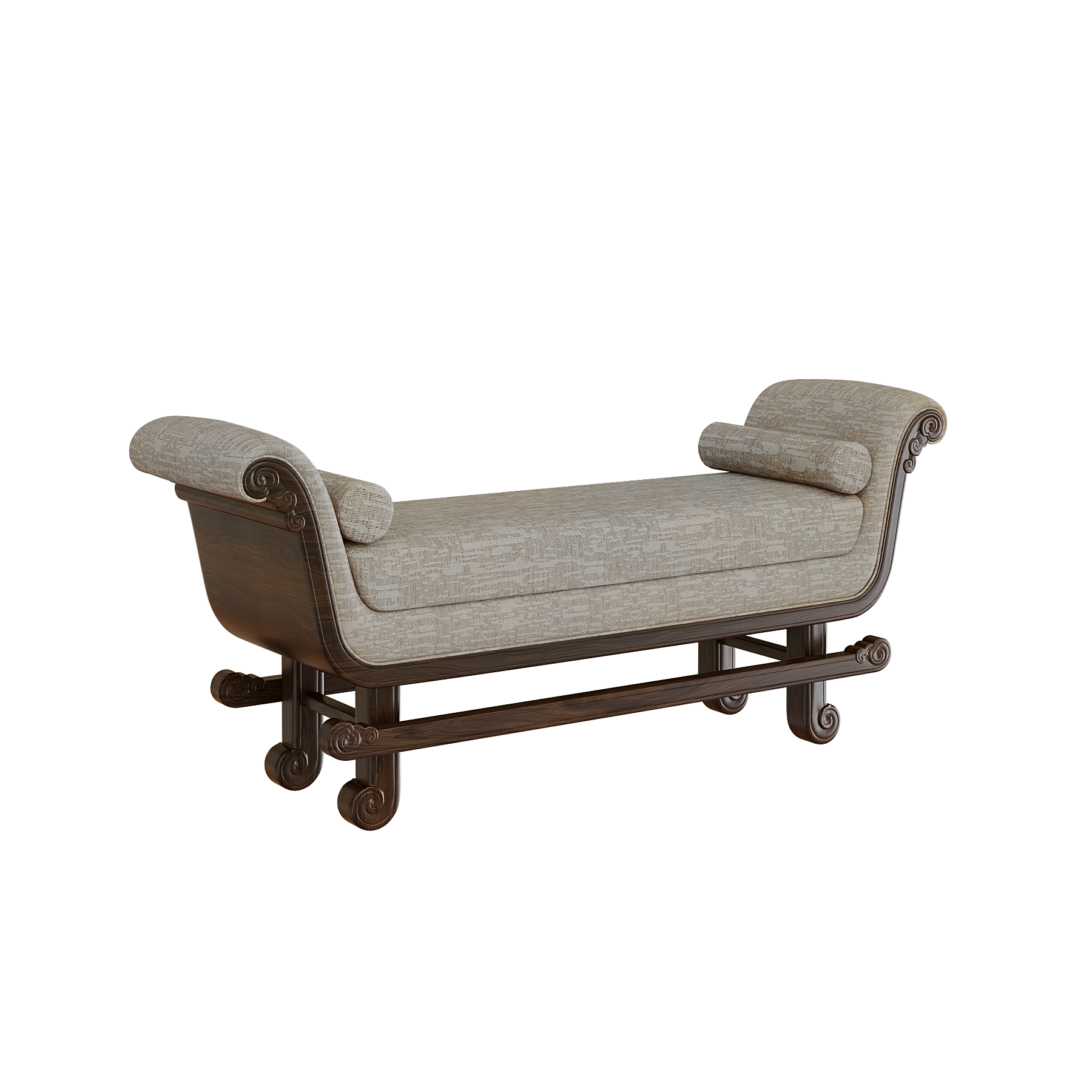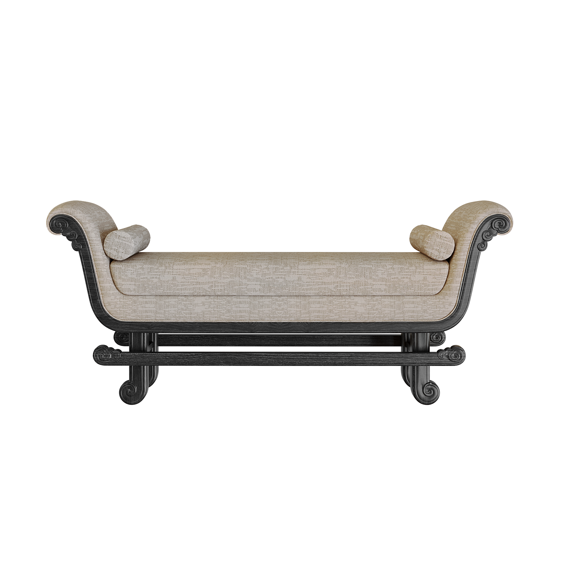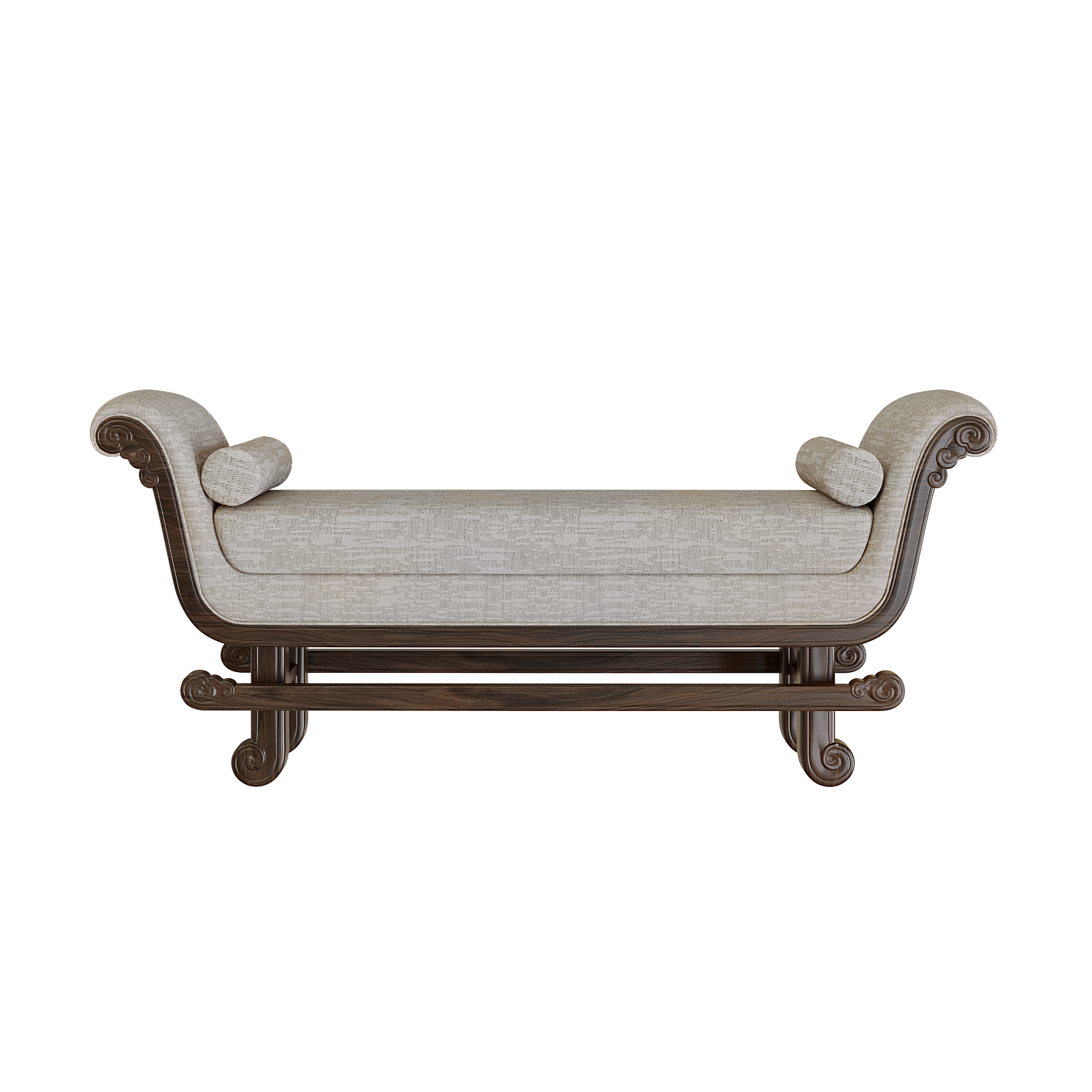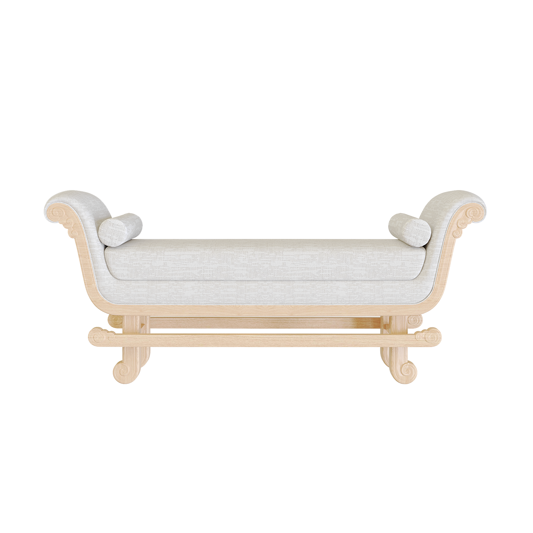Đôn cuối giường Diễm Vân mang đậm dấu ấn văn hóa Việt với họa tiết Mây Lửa và chi tiết Đầu Dư cách điệu, lấy cảm hứng từ kết cấu nhà gỗ truyền thống. Các đường nét mềm mại, uyển chuyển giữa khối tựa và chân gợi nhắc hình ảnh mái đình, mái chùa xưa, vừa trang nghiêm vừa gần gũi.