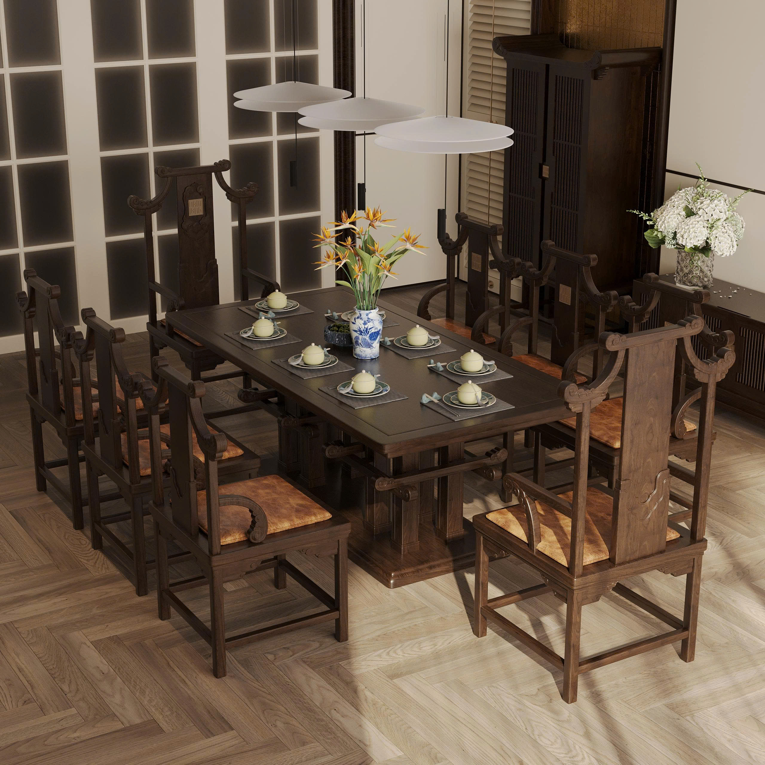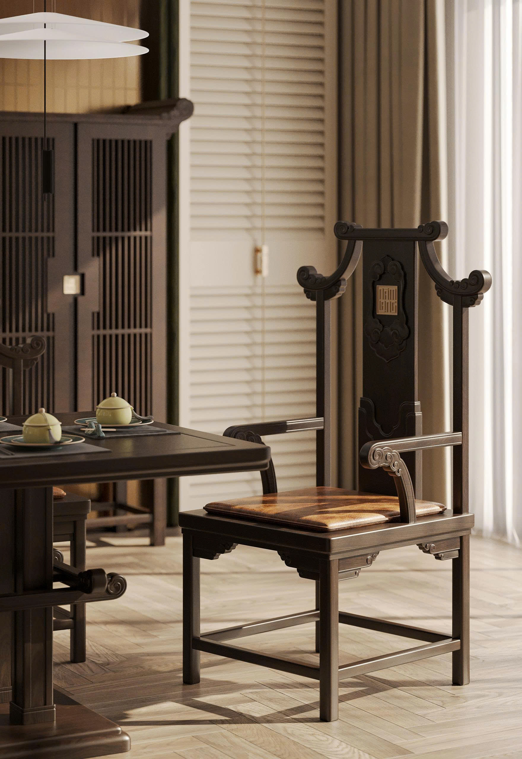 Ghế Ăn Gia Chủ Diễm Vân được thiết kế với họa tiết Mây Lửa và chi tiết Đầu Dư cách điệu, lấy ý tưởng từ kết cấu nhà gỗ truyền thống Việt Nam. Đây là sự kết hợp giữa yếu tố văn hóa cổ truyền và tinh thần thiết kế đương đại, tạo nên vẻ đẹp thanh thoát nhưng vẫn bền vững.