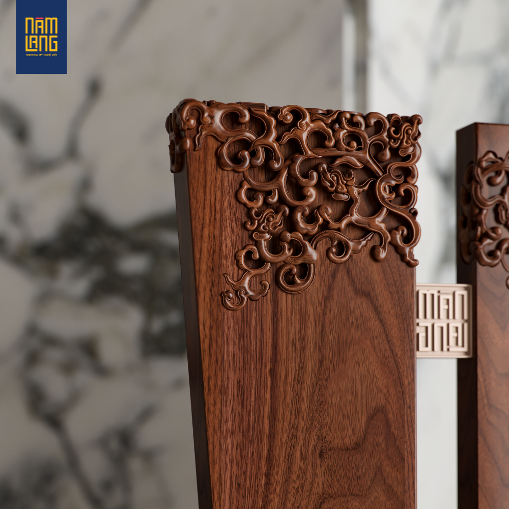 Các chi tiết Thủy Ba mềm mại xuất hiện trên những thanh đỡ, tạo sự uyển chuyển, cân bằng giữa sức mạnh và sự thanh thoát. Sự kết hợp này giúp ghế vừa mang tính nghệ thuật cao, vừa mang giá trị sử dụng bền vững, trở thành điểm nhấn sang trọng trong không gian thưởng trà.