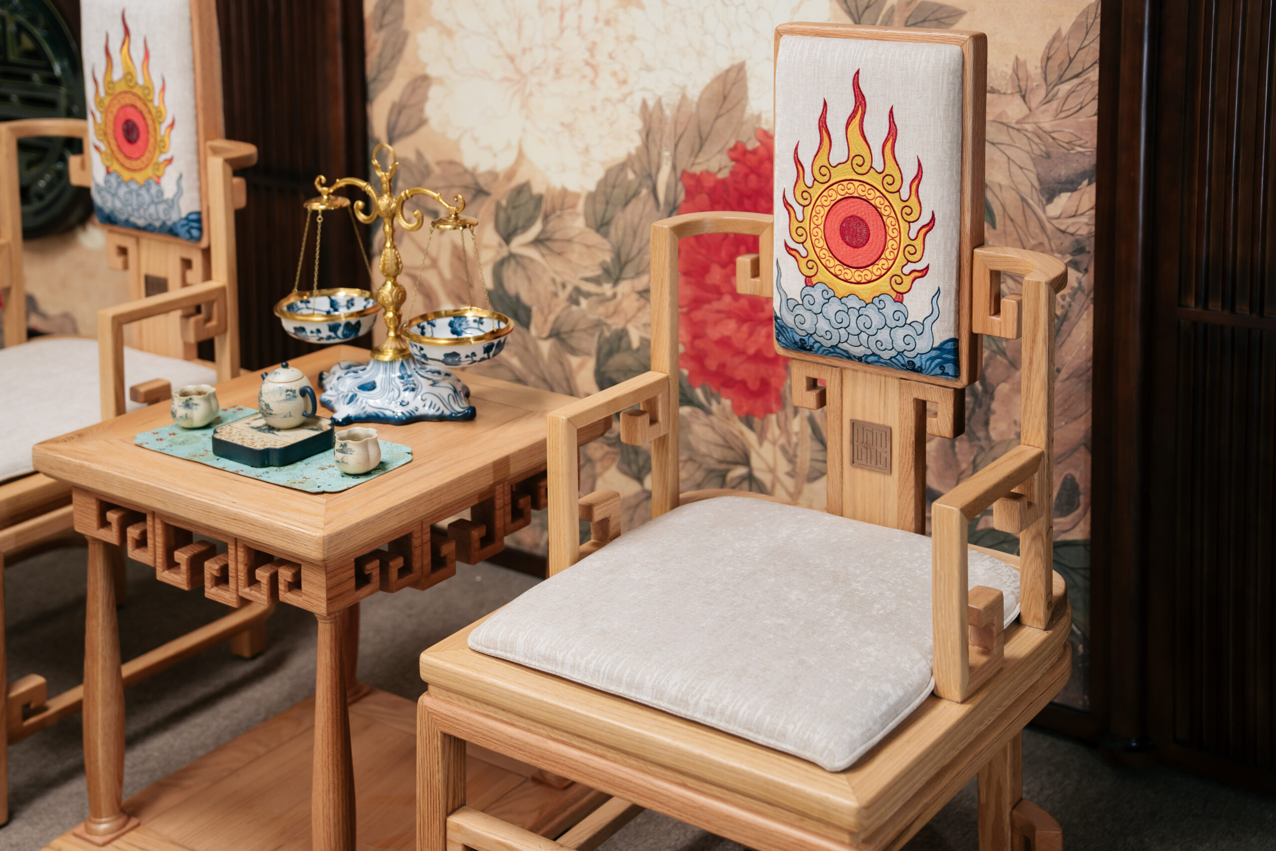 Điểm nhấn đặc biệt nằm ở lưng ghế thêu hình tượng mặt trời triều Nguyễn, sử dụng màu sắc gợi nhớ đến tranh dân gian Hàng Trống, biểu hiện cho vương quyền và uy thế. Dáng ghế được phỏng theo ghế tựa truyền thống, mang đến cảm giác trang nghiêm và sang trọng, đồng thời vẫn đảm bảo sự thoải mái khi sử dụng.