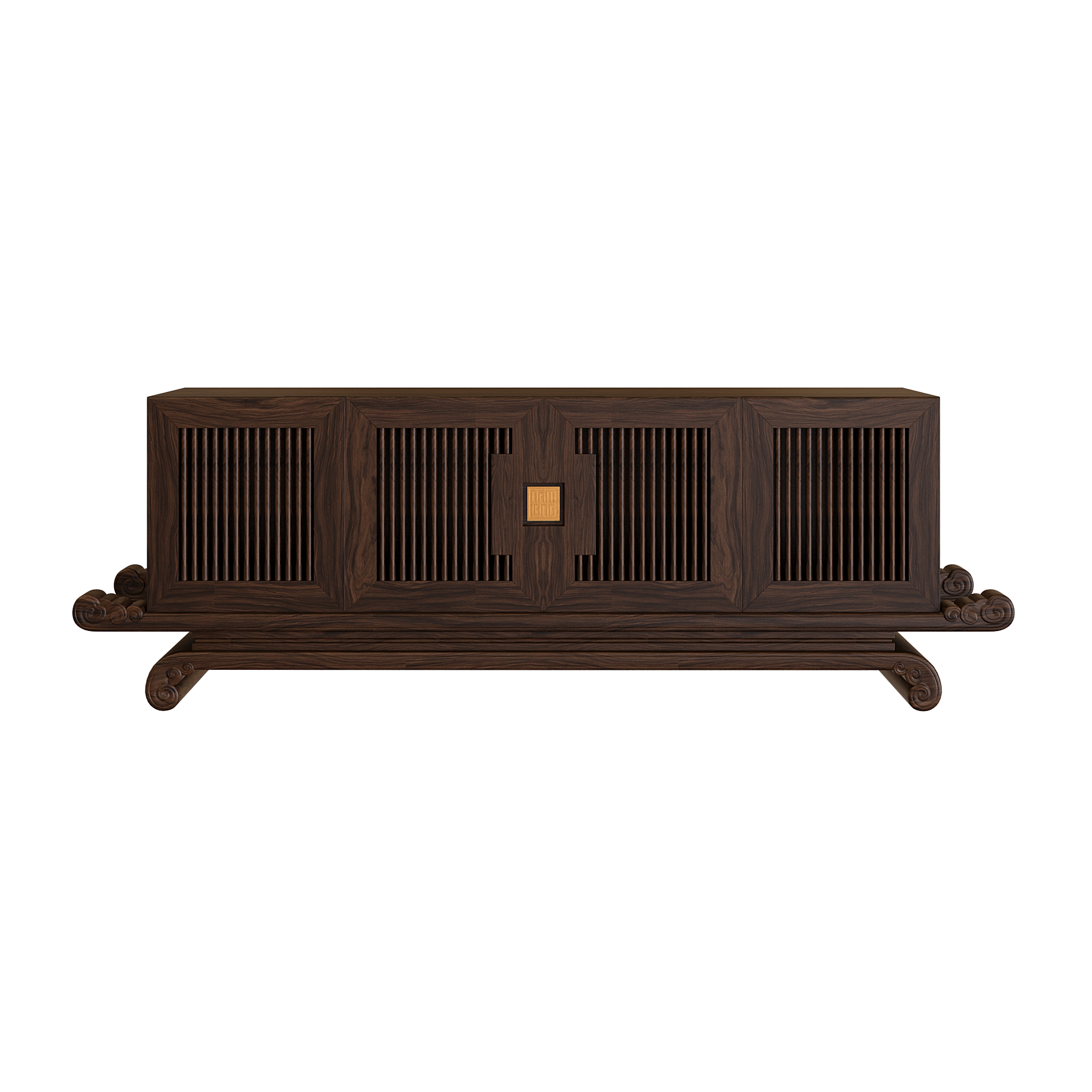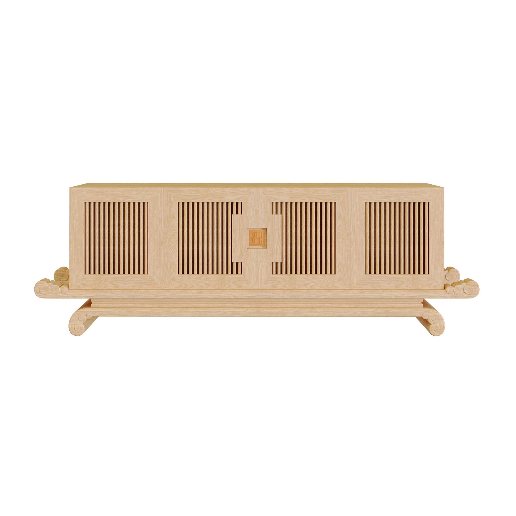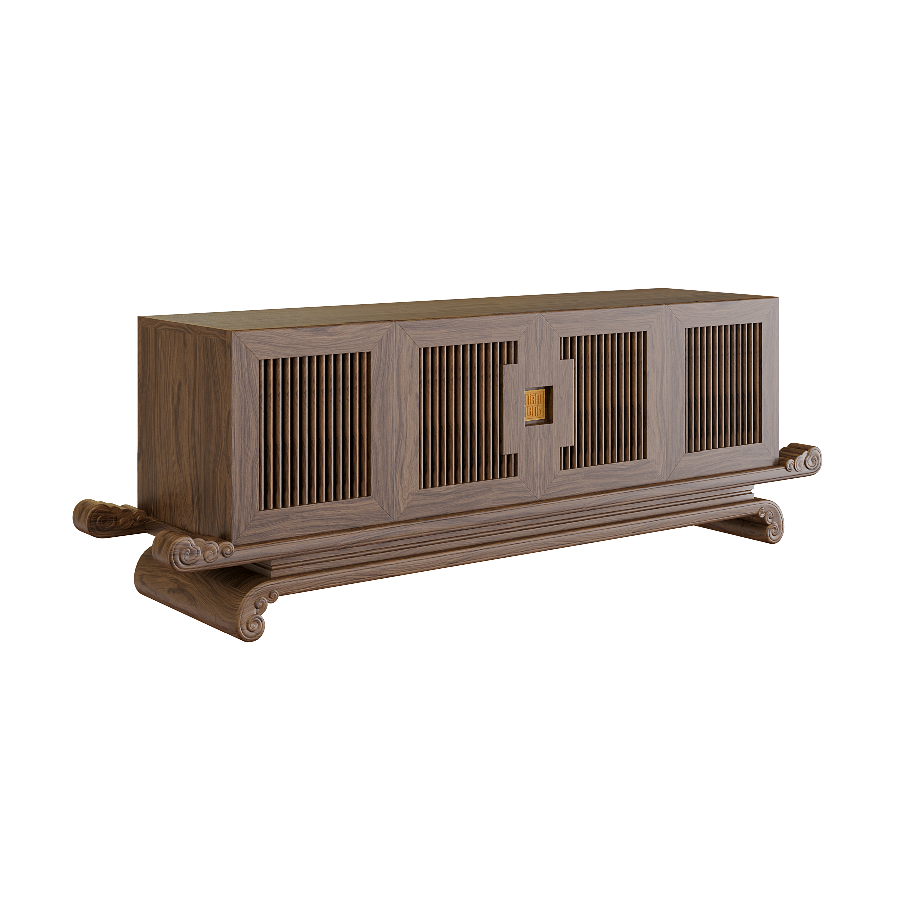 Kệ TV Diễm Vân được thiết kế lấy cảm hứng từ kiến trúc truyền thống Việt Nam, nổi bật với họa tiết Mây Lửa mềm mại và chi tiết mô phỏng thanh đòn của kiệu cổ. Sự kết hợp này mang đến dáng vẻ trang trọng, gợi nhắc nét đẹp văn hóa Việt trong không gian sống hiện đại.