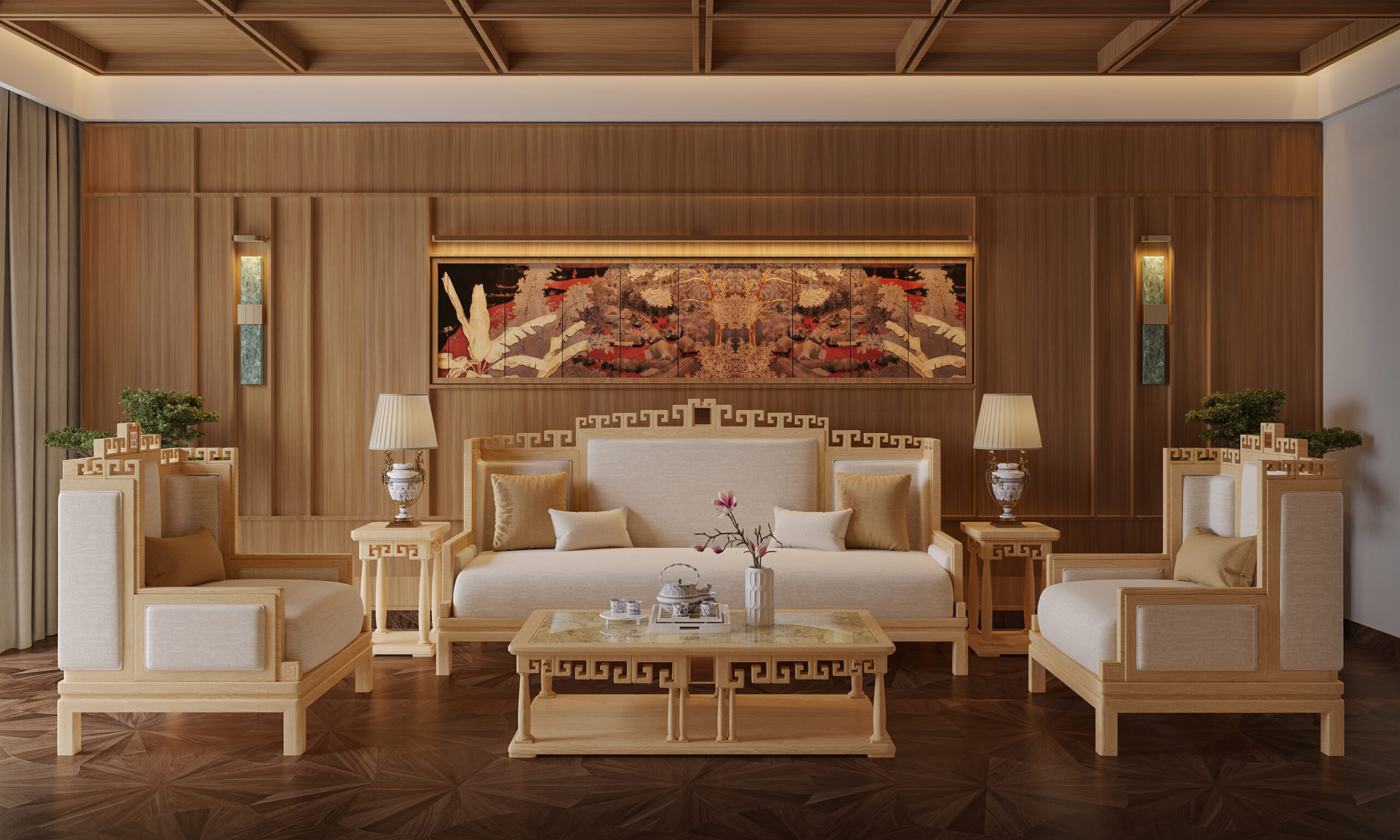 Các chi tiết trang trí được cách điệu gọn gàng, kết hợp với hình tượng chạm khắc truyền thống. Mặt bàn có thể tùy biến với hiệu ứng sơn mài tinh xảo, phối hợp hài hòa với sofa và ghế, tạo thành một tổng thể phòng khách sang trọng và đồng bộ.