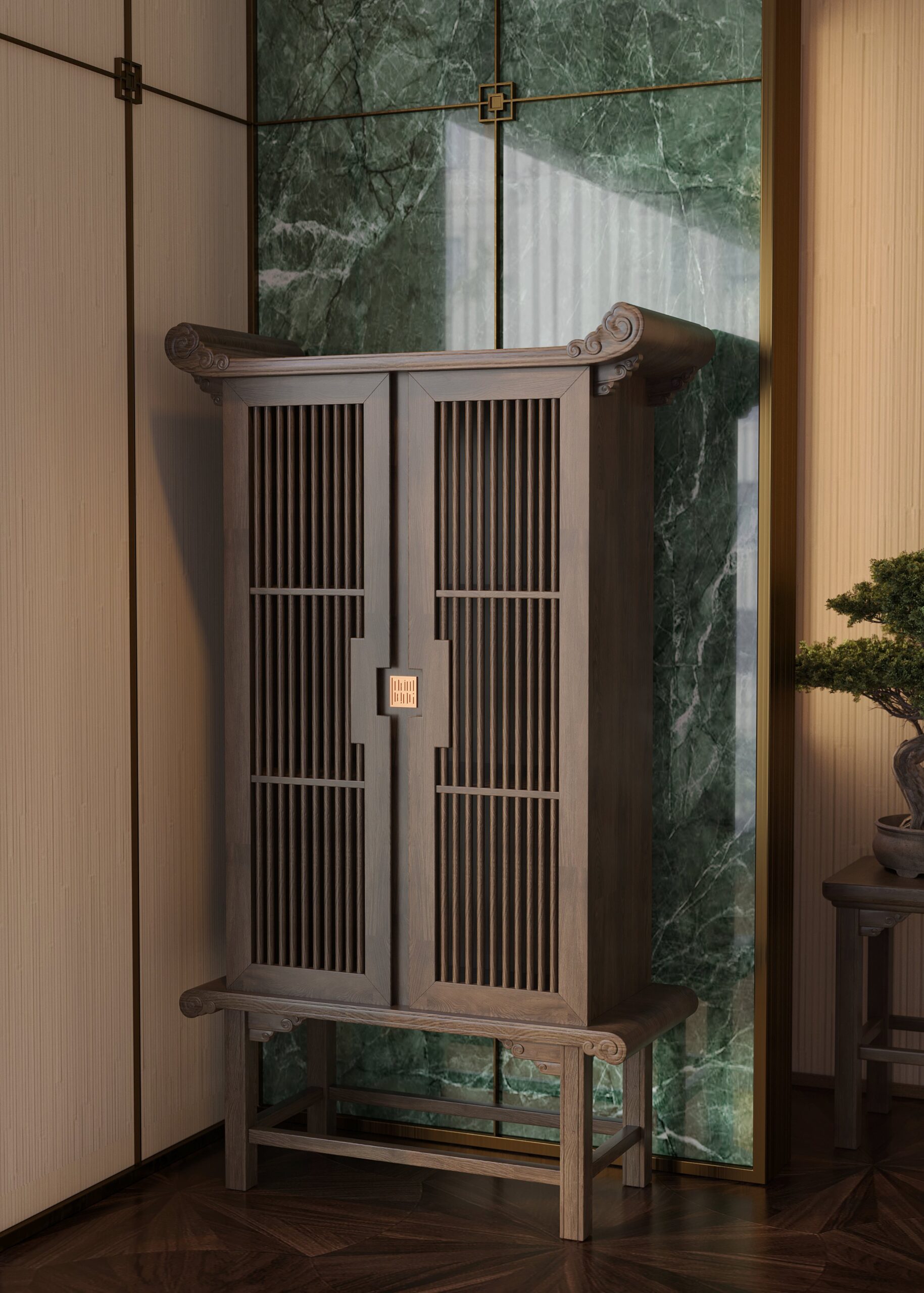 Phần cánh tủ nan gỗ thanh thoát, thông thoáng, kết hợp cùng kết cấu vững bền, mang lại sự cân bằng hoàn hảo giữa công năng hiện đại và giá trị thẩm mỹ truyền thống. Đây là thiết kế không chỉ tiện dụng mà còn góp phần tôn vinh bản sắc Việt trong không gian sống sang trọng.
